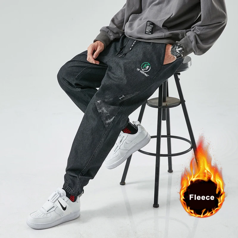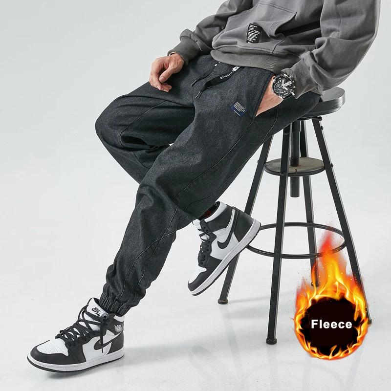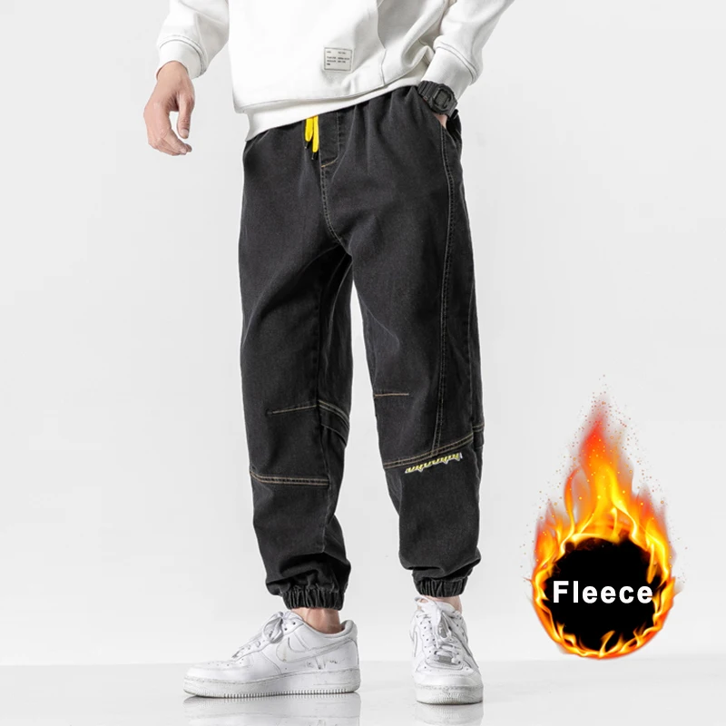 2021 New Men's Winter Fleece Jeans Thick Warm Denim Pants Men Streetwear Black Joggers Harem Jean