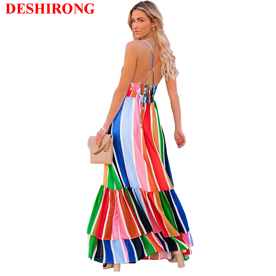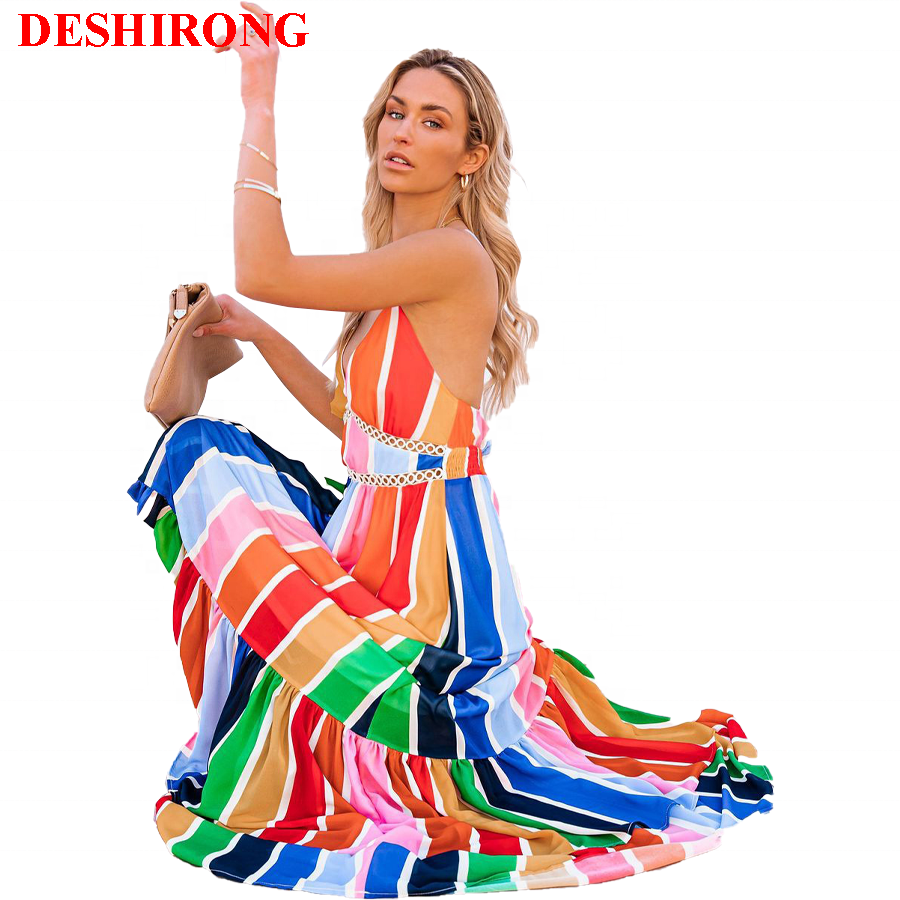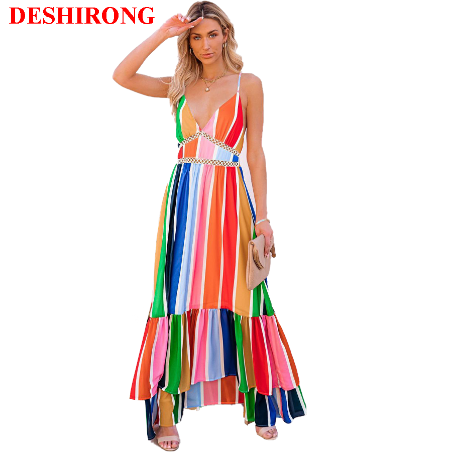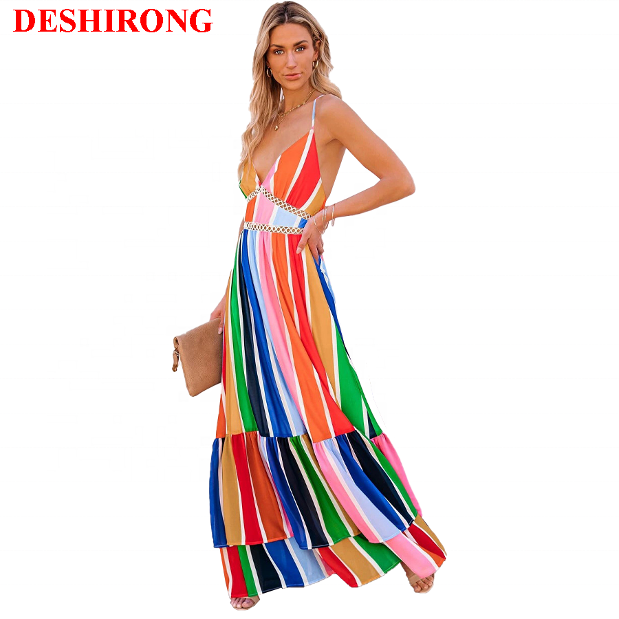 2022 New Elegant Rainbow Striped Print Lace Stitching Deep V Straps Long Women's Fashion Bohemian Chiffon Dress