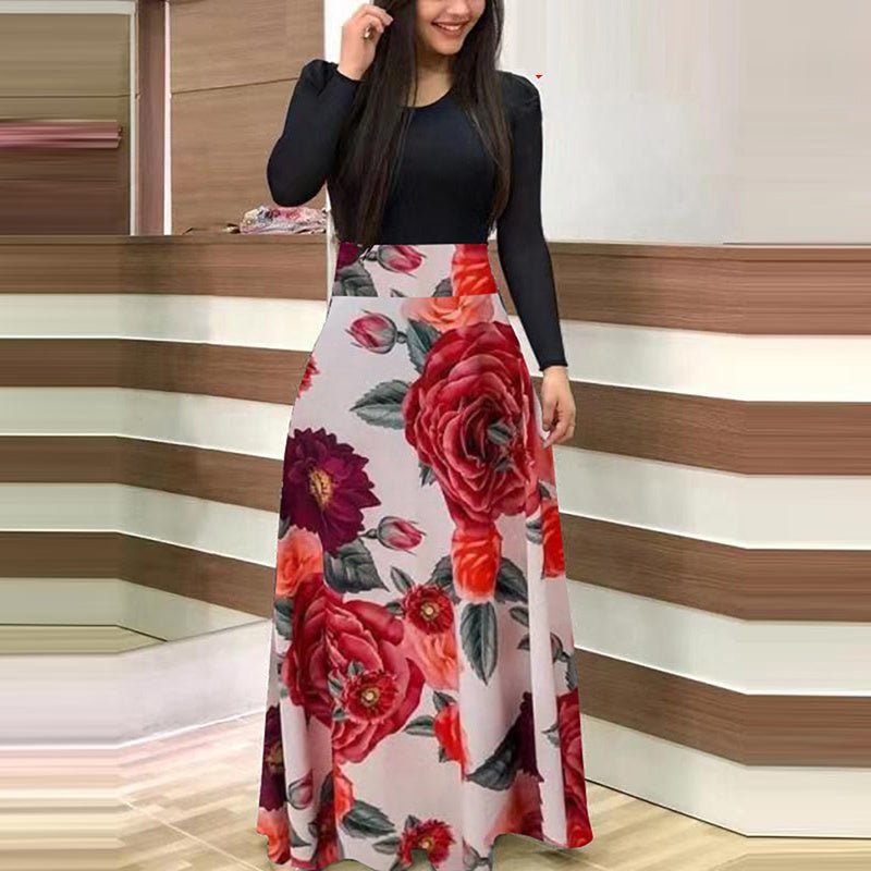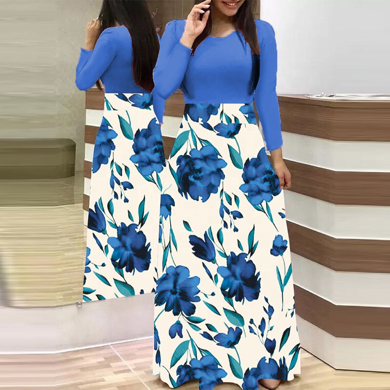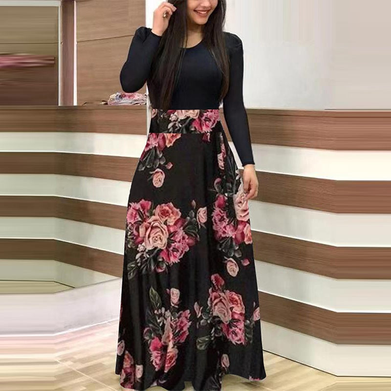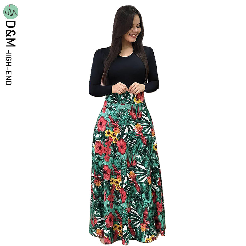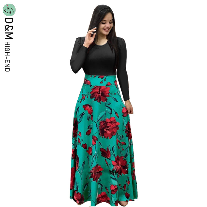 D&M Spring Autumn Ladies Casual Ankle-Length Vestido Women Muslim Dress Female Fashion Long Sleeve Floral Print Long Maxi Dress