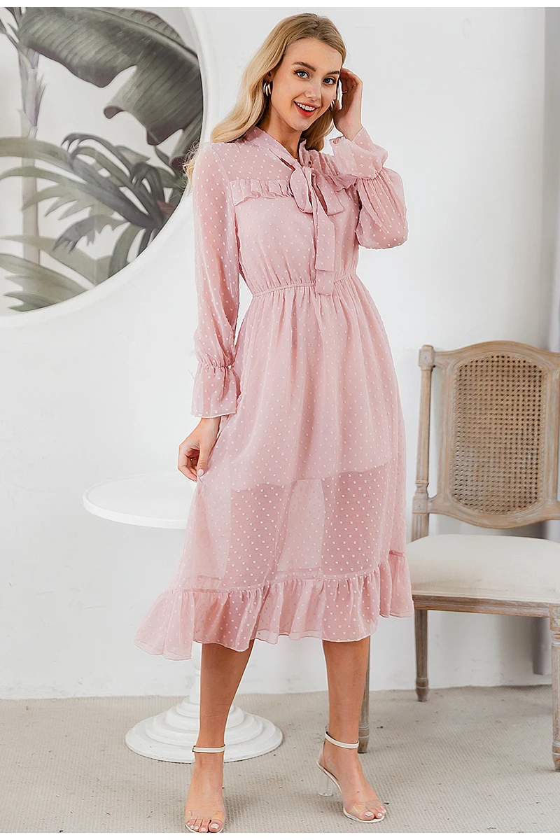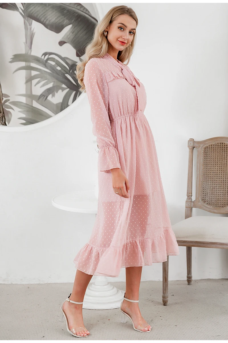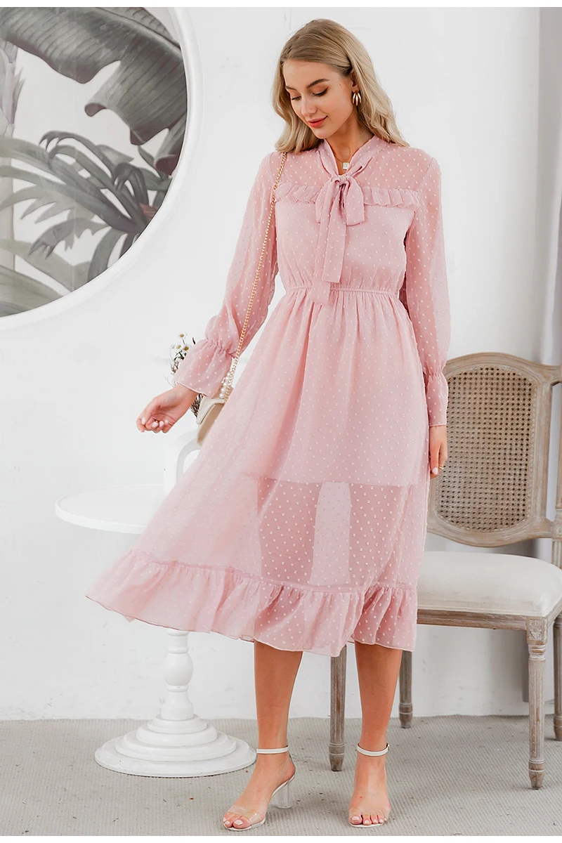 Hollow out women party dress Casual ruffled high waist bow long sleeve maxi dress Chic ladies