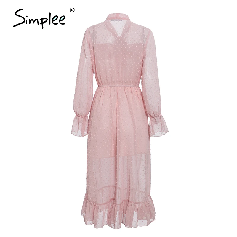 Simplee Hollow out women party dress Casual ruffled high waist bow long sleeve maxi dress Chic ladies holiday work summer dress - goldylify.com