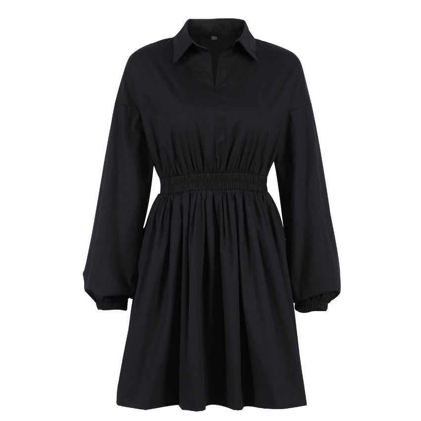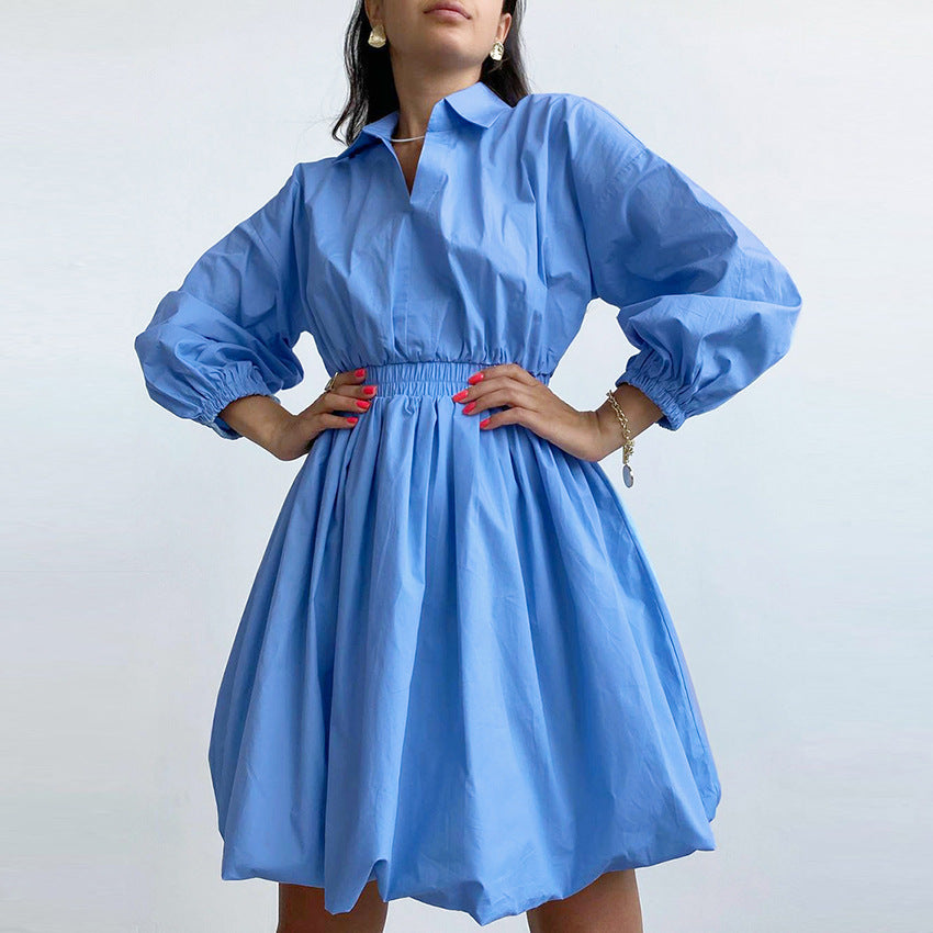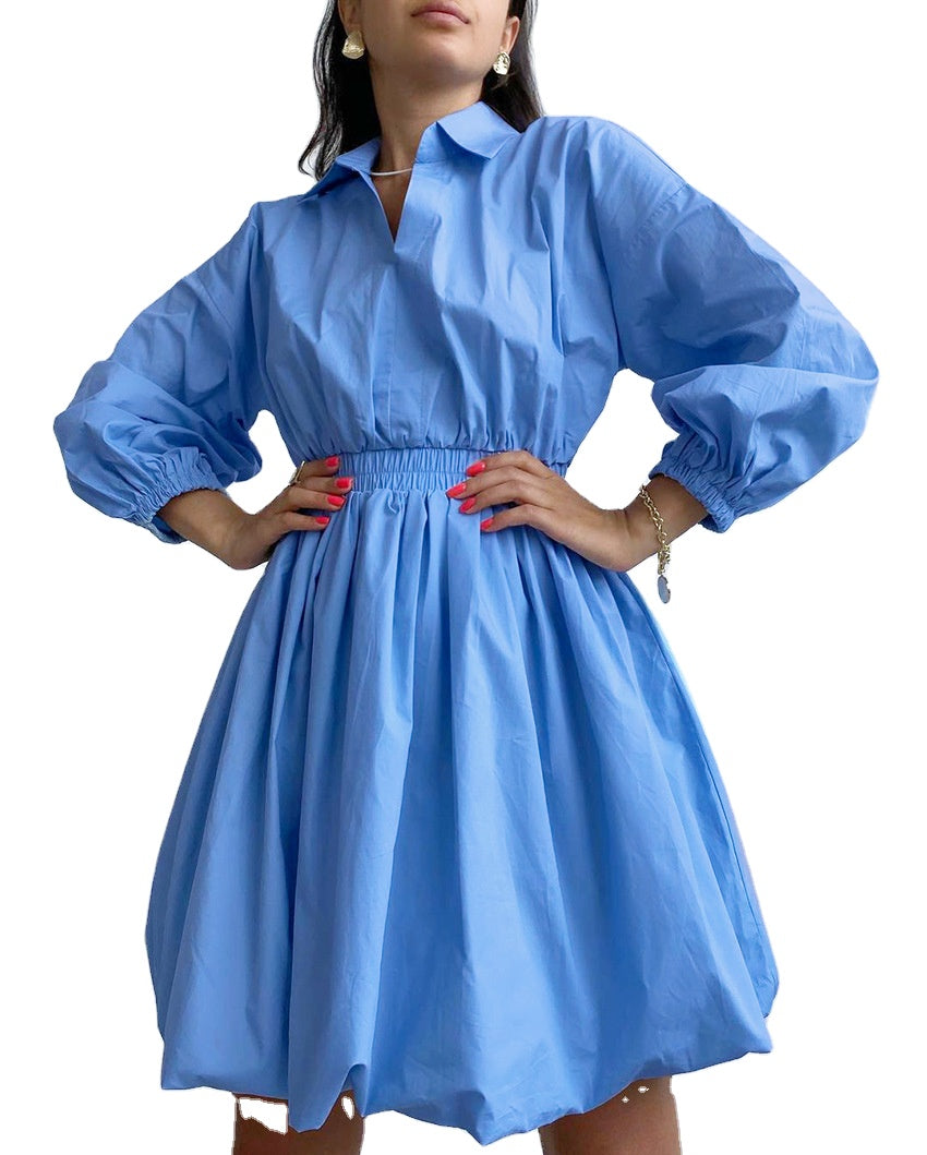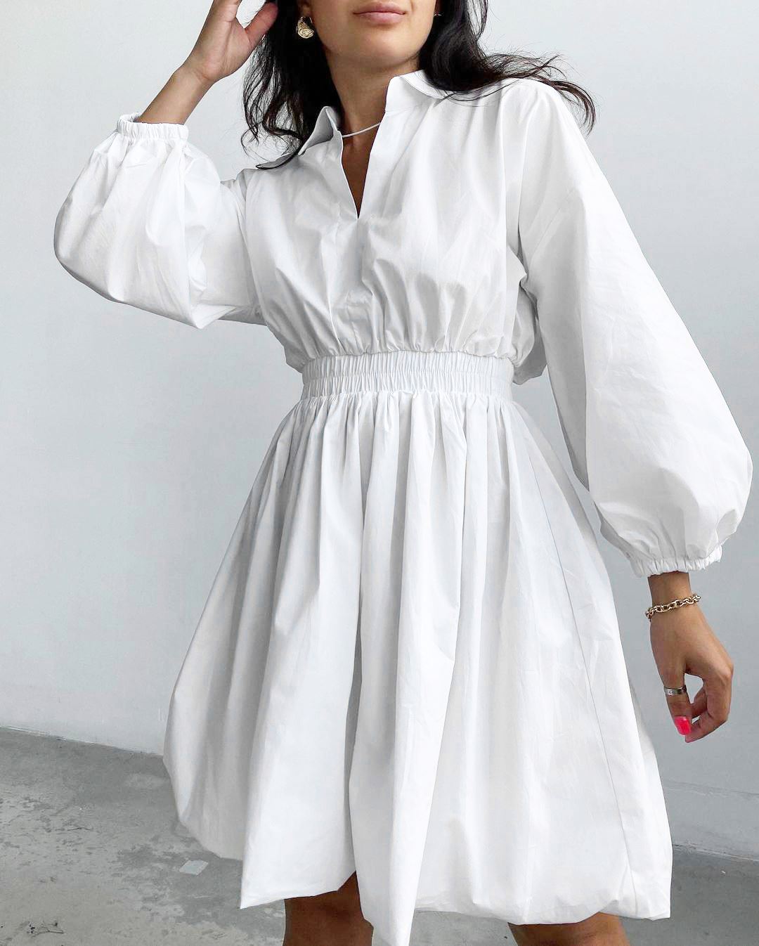 New 2022 Ladies Dresses Puff Sleeve Solid Color V-neck 100%cotton Women Elegant Office Shirt Dress