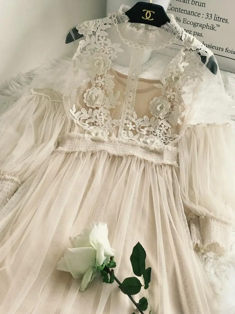 Women Lace Flower Dress Long Gauze Lantern Sleeve Voile Long Dress Female Retro Hook Princess