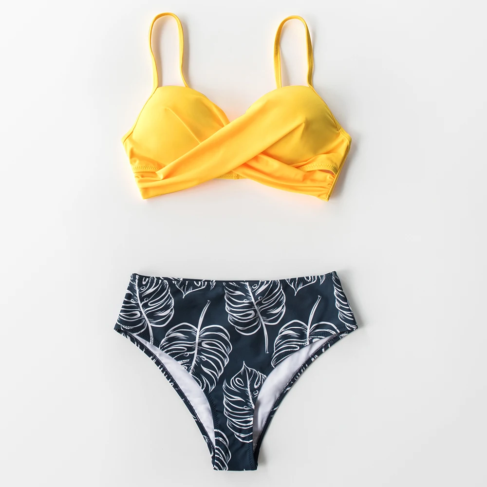 Eine unserer besten-verkauf badeanzüge, jetzt mit mehr büste unterstützung! Die Gelb Twist-Front und Palm Print High-Taille Bikini hat moulded tassen, verstellbaren trägern, und eine zurück haken verschluss zu gewährleisten sie erhalten die form und heben sie wollen. Die hoch taillierte unterseite bietet schmeichelhaft bauch abdeckung.