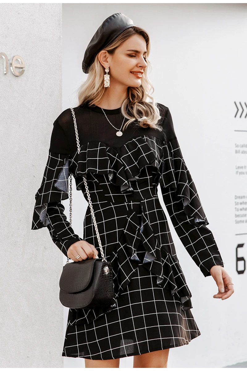 Elegant office lady plaid dress Ruffled long sleeve mini dress Streetwear straight o-neck autumn chic short party dress