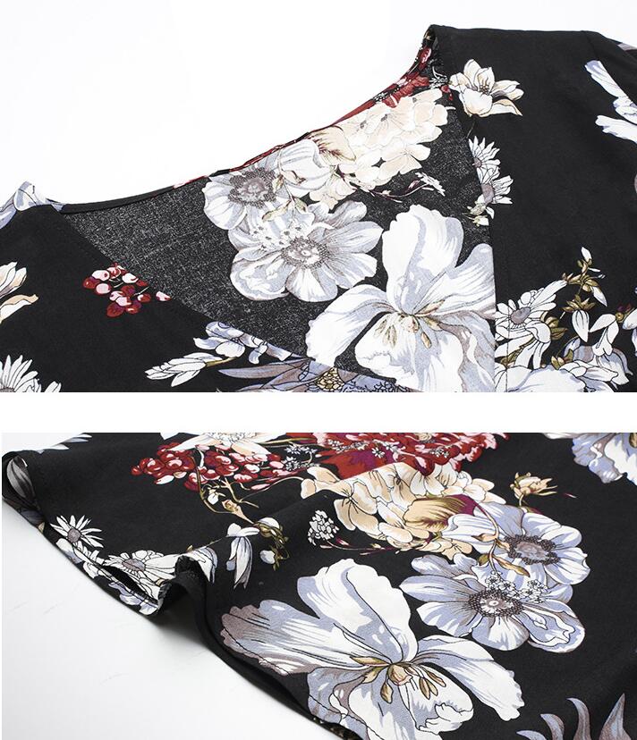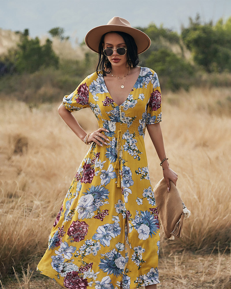 Women Bohemia V-neck Maxi Dresses Floral Print Autumn Beach Boho Dress Short Sleeve Retro Hippie Vestidos Y10831